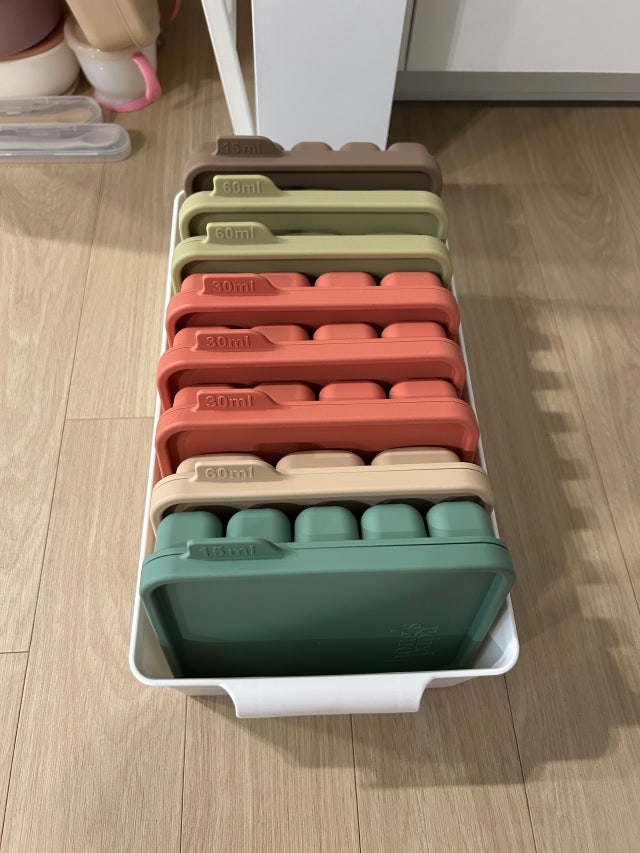 30ml가 제일 유용하다고 해서 3개 했습니다 아주 잘 쓸 것 같습니다 이유식 이후에는 과자를 굽거나 다른 용도로도 쓰려고 합니다 먹다 못먹을만한 잼도 얼리기 좋을 사이즈 같아요 그리고 다이소에서 산 바구니에 딱 들어가서 냉동실에 같이 넣기 좋아요 저대로 냉동고에 자리할 예정입니다 사이즈 정말 딱이에요
