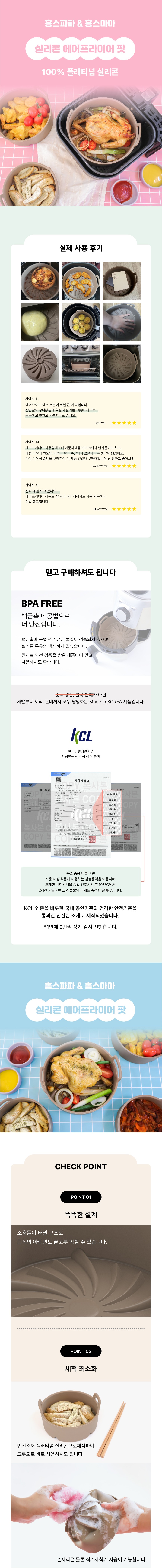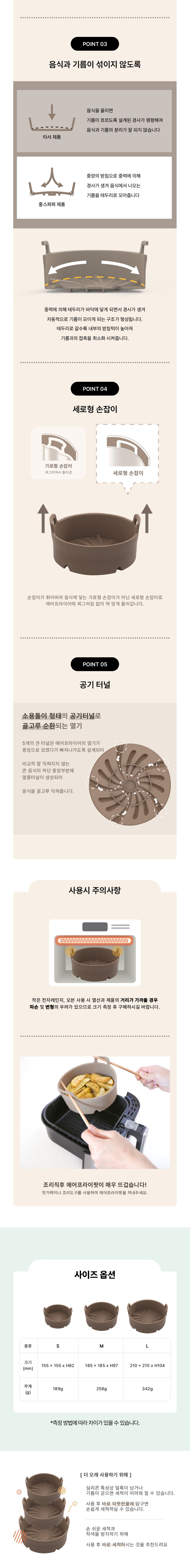 -40℃ ~ 250℃ 까지 견딜 수 있는 플래티넘 실리콘 소재로 에어프라이어는 물론 전자레인지, 오븐용기로도 사용가능합니다.